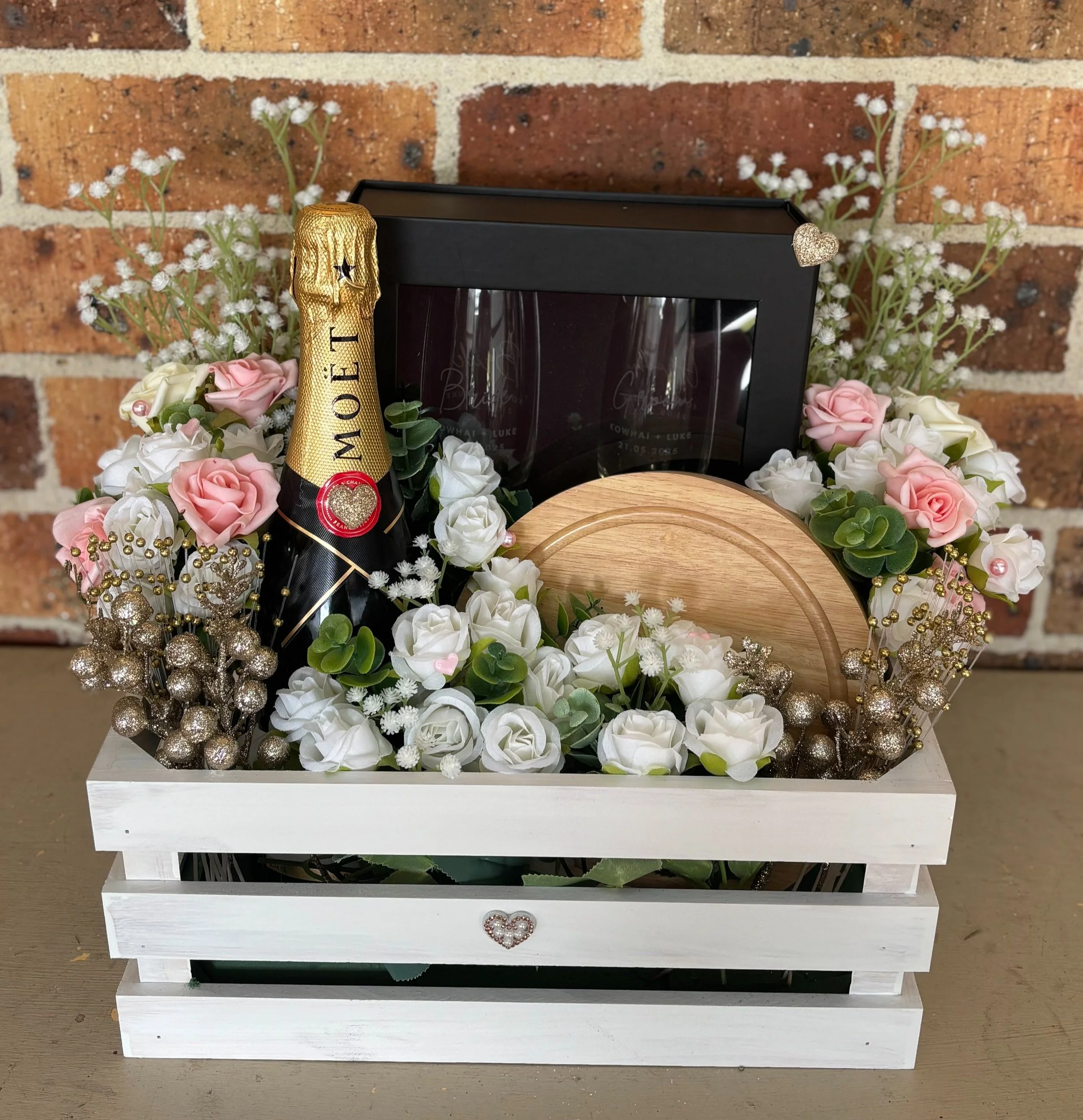 Use of glittered leaves, berries, baby’s breath, lavender stems etc